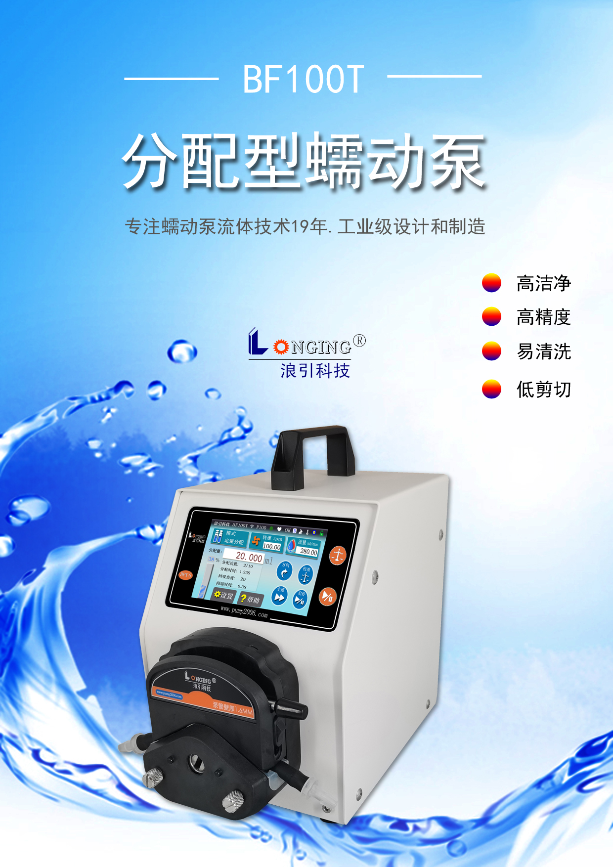 分配型蠕动泵 具备定量分配和计量输送功能。彩色触摸屏操作界面,RS485通信接口,可分配量校准、流量标定、流量在线校准,有多种运行模式。是各种场合小剂量高效精准灌装及定时定量恒流加药的首选。